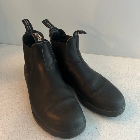 Dr. Martens støvler i størrelse 43. Klassiske ankelhøye støvler i svart skinn med elastiske sidepaneler og hempe bak for enklere av- og påkledning. Yttersåle i gummi med profil for bedre grep. Passer som hverdagsstøvler i ulike værforhold.