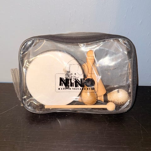 Barneinstrumentsett med tamburin, rytmeegg og maracas. Tamburinen er rund med lys ramme og metallbjeller. Rytmeegget er lite og rødt, tilpasset barnehender. Maracasen er i tre med håndtak og hvit topp dekorert med fargede stjerner. Instrumentene er egnet for enkel rytmelek og introduksjon til musikk for barn.