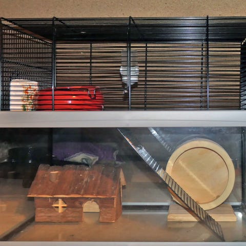 Smådyrbur i gjennomsiktig plast med metallgitter på toppen. Buret har innebygde plasttunneler i front, løpehjul i plast, matskål og drikkeflaske. I tillegg følger det med et lite hus i plast og et lite hus i tre som kan brukes som skjulested for smådyr. Egnet for mindre gnagere som for eksempel hamster eller mus, avhengig av størrelse og behov. Buret har flere ventilasjonsåpninger og er utformet for innendørs bruk.