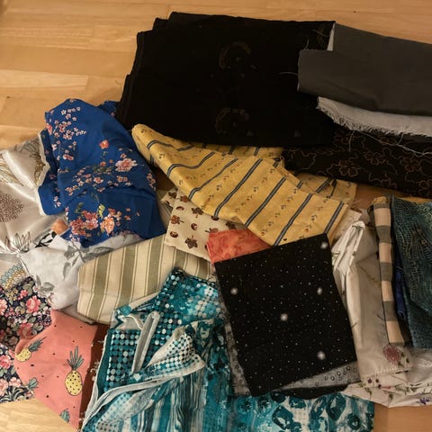 250 kr for 2,5 kg fyll opp poser. Hele stoffdeler selges