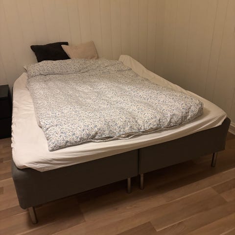 Tempur seng trukket i mørk grå tekstil. Sengen består av to underdeler med overmadrass og enkel, rett hodegavl i samme tekstil. Den står på krom treben som gir god høyde fra gulvet. Passer som dobbeltseng i soverom. Egnet for bruk med standard sengetøy og tilbehør for dobbeltsenger.
