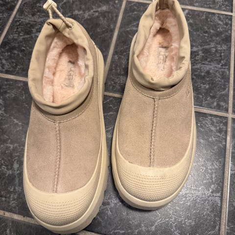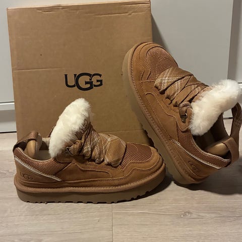 UGG sneakers/joggesko. Det står på str at den passer til en med str 41, men vil regnes med å passe en som bruker sko str 38-39 da størrelsen en mindre en antatt. Skoene har brun farge og overdel i en kombinasjon av semsket materiale og tekstil. Innvendig er de fôret med mykt, lyst fôr som gir ekstra varme og komfort. Modellen har kraftig yttersåle med mønster for bedre grep, samt kraftige lisser foran. Passer som hverdags- og fritidssko i kjøligere vær.
