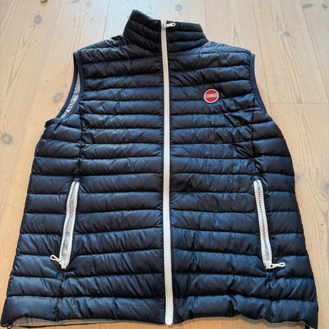 Colmar dunvest for herre i størrelse 46. Vesten er marine blå og fylt med dun, med vattert, horisontalt quiltet design. Den har glidelås i front og glidelåslommer i sidene. Passer som ytterplagg på mildere dager eller som et ekstra isolerende lag under jakke.