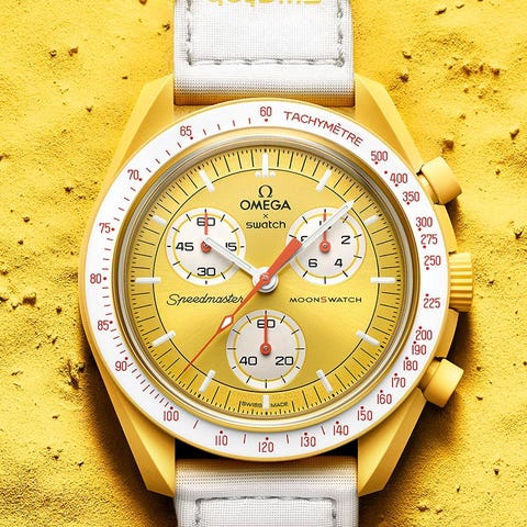 Omega Mission on Earth Desert herreklokke. Modellen tilhører Bioceramic MoonSwatch-kolleksjonen. Klokken har rund urkasse med kronografvisning og tre subdials på skiven. Den leveres med rem som festes med spenne. Analog visning med time-, minutt- og sekundviser. Klokken passer til herre og egner seg til daglig bruk. Eventuell original eske, dokumentasjon og kvittering følger med slik det vises på bildene.