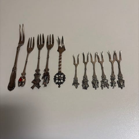 Seks sølvskjeer, initialer og årstall (18)96 gravert på baksiden. En liten bulk i en skje. Lengde 18,5 cm og vekt 30 gram. Sølvprisen alene er 2350 kr