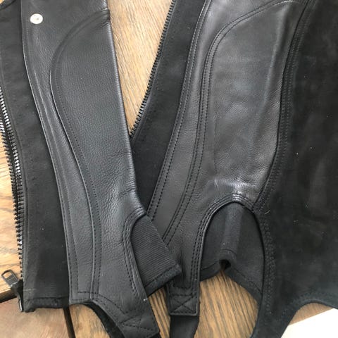 Brune chaps i lær til ridning. Chapsene er lange og dekker leggen opp til låret. De har glidelås langs siden og elastiske felter for bedre passform. Egnet til bruk utenpå ridebukse for ekstra varme og beskyttelse.