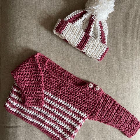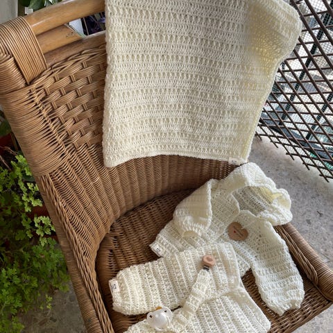 Heklet sett til baby hvit og fersken farget.
