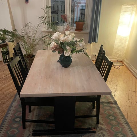 Bordet er tungt og stabilt, i lys matt finish og med god plass til mange gjester. Har vært brukt til familieselskaper og fungerer fint til hverdagsbruk. Kan utvides med tilhørende ileggsplate som kan legges inn på høyre eller venstre side