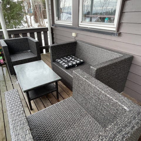 utegruppe i rotting, 6 reclinerstoler og bord med glassplate. Noe slitasje må påberegnes. Puter medfølger, kan ha godt av en liten vask.