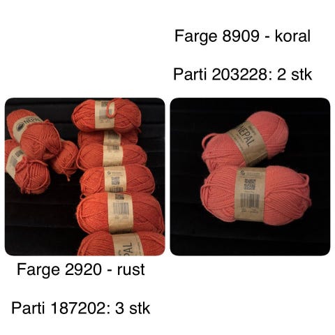Pakke med blandet garn og strikkebøker. Garnet består av flere ulike typer og kvaliteter i forskjellige farger, blant annet lyse og mørke nyanser, rødt, oransje, grått, rosa og blått. Noen nøster er merinoull og alpakkagarn, andre er blandingsgarn.