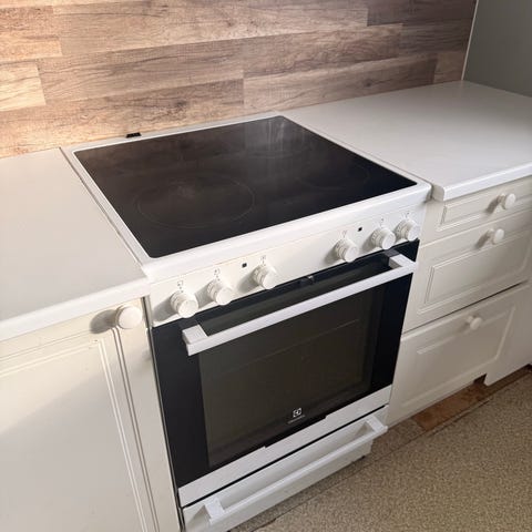 Bosch keramisk komfyr i hvit utførelse. Komfyren har platetopp med fire keramiske kokesoner og stekeovn med frontåpning. Betjening skjer via dreieknapper på fronten. Under stekeovnen er det en sokkelskuff for oppbevaring av utstyr. Passer til frittstående plassering på kjøkkenet der det er tilkobling for komfyr.