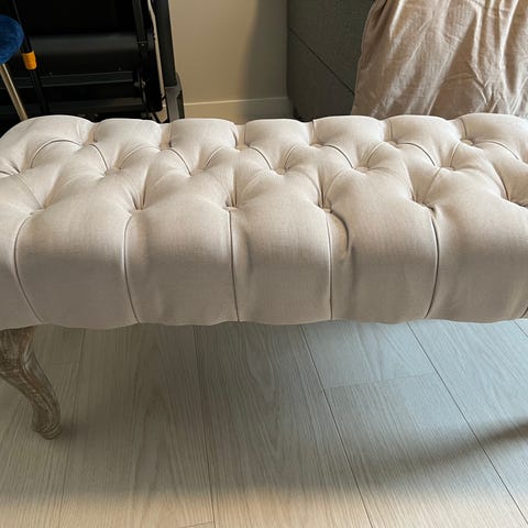 Stoffet er slitt, så det bør skiftes ut. Meget enkelt å trekke om selv, og få det akkurat slik det passer inn i eget husvære.