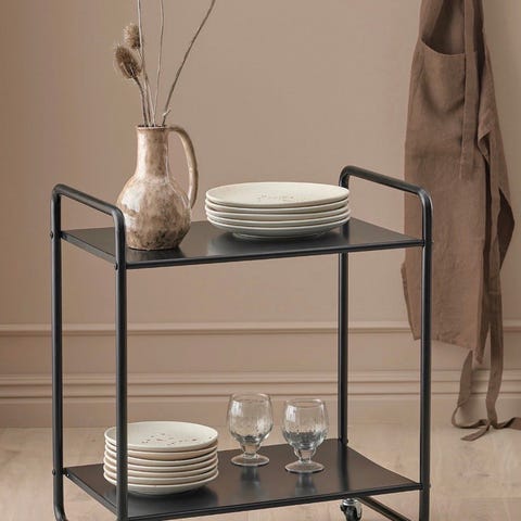 Elegant bartralle i sort metall og glass – med hjul