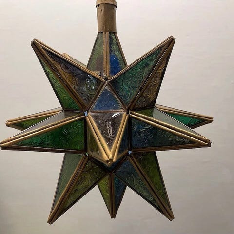 Vakker vintage glasspendellampe. Lampen er i god stand og klar til å henges opp, men mangler støpsel. Den gir et stemningsfullt lys i rommet. Glasskuppelen er fra 1960- eller 1970-tallet, usikker på selve festet.