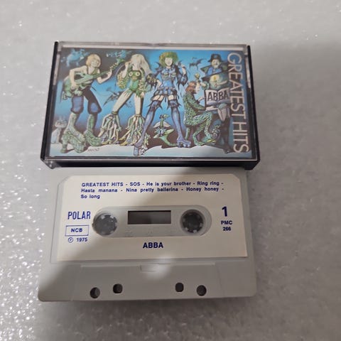 Kassetten inneholder et utvalg av ABBA-låter samlet på albumet «Greatest Hits». Cover og kassett med trykt informasjon om sporene på begge sider. Format: analog lydkassett (stereo). Egnet for avspilling på kassettspiller som støtter standard kompaktkassett.