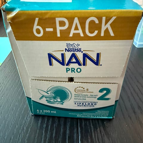 Nestlé NAN Pro 2 morsmelkerstatning i ferdigblandet flytende form. Produktet er pakket i små drikkekartonger med skrukork på toppen. NAN Pro 2 er en tilskuddsblanding beregnet for spedbarn fra 6 måneder og oppover, som en del av et variert kosthold. Kartongene er porsjonerte og kan være praktiske til bruk hjemme eller på reise. Informasjon om holdbarhetsdato og nøyaktig volum per kartong står trykt på emballasjen.