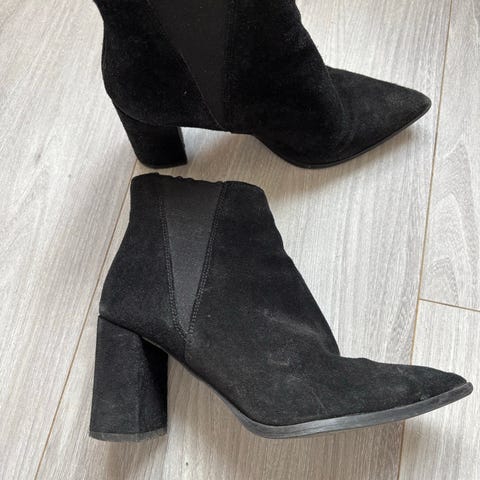 Bianco ankelstøvletter i størrelse 39. Modellen er en ankelhøy sko med hæl og elastiske felt på sidene for enklere av- og påtaking. Fargen er svart. Skoene passer til bruk til hverdags og mer formelle anledninger, og kan kombineres med både bukser, skjørt og kjoler.
