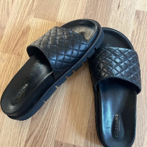Roberto rosso sandaler i størrelse 40. Modellen har to justerbare remmer over foten med quiltet mønster og metallfargede detaljer. Fargen er svart. Sålen er flat og heldekkende, egnet til hverdagsbruk i varme perioder eller som innesko.