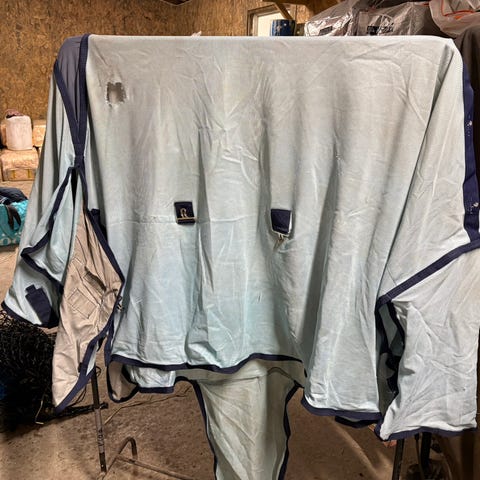 Fairfield fluedekken. Brune merke på halsen som ikke går vekk. Har prøvd å få det vekk. Str 135 noen hull her og der men fungerer fint ellers