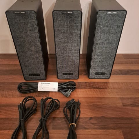 Sonos Symfonisk trådløs høyttaler i svart. Høyttaleren er utviklet i samarbeid med Ikea og er laget for bruk sammen med Sonos-systemet via Wi‑Fi. Den har stofftrukket front, fysiske knapper for volum og avspilling på fronten og tilkobling for strøm på baksiden. Høyttaleren kan brukes alene eller pares med andre Sonos-enheter for stereolyd eller flerromsoppsett. Egner seg til bruk i stue, soverom eller kontor der man ønsker integrasjon i et eksisterende Sonos-oppsett.