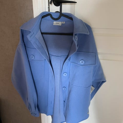 Zara jakke for dame i størrelse M. Jakken er i blå ullkvalitet med krage og knappelukking foran. Modellen har brystlommer med klaff og trykknapper. Passer som ytterjakke eller lett overgangsjakke. Farge og materiale er basert på merkelapp og visuelt inntrykk.