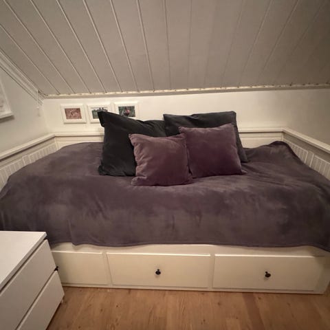 IKEA dagseng med skuffer i hvit utførelse. Sengen har rygg- og sidepaneler, og to romslige skuffer i underdelen for oppbevaring. Egnet som enkeltseng til daglig bruk eller som ekstra soveplass i gjesterom, stue eller barnerom. Nøytral farge som passer inn i ulike interiørstiler.