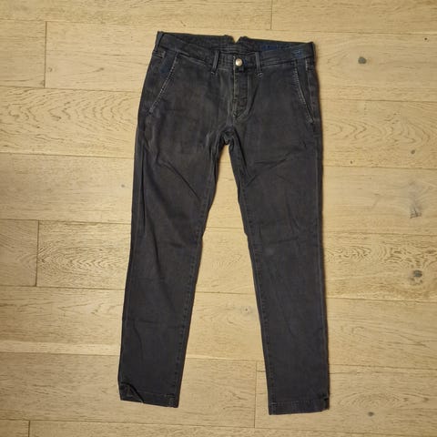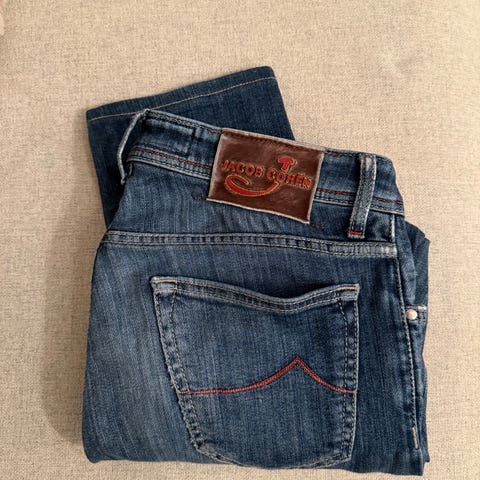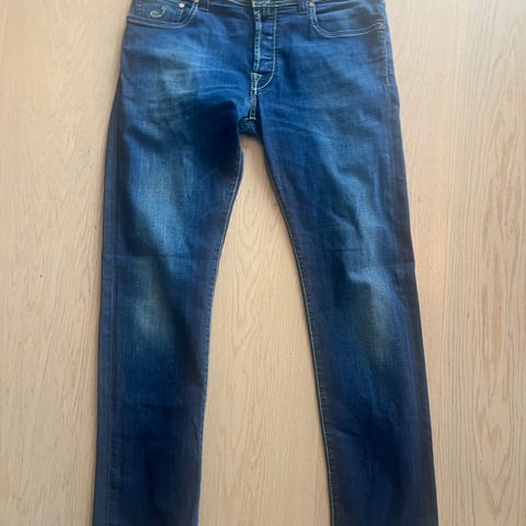 Jacob Cohën jeans for herre i blå denim. Buksen er i bomull og har livvidde W32 og størrelse M. Klassisk 5-lommers modell med knappelukking i gylfen og karakteristiske logodetaljer på lomme og bakre linning. Passer til hverdagsbruk og kan kombineres med både skjorte og t-skjorte.