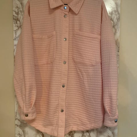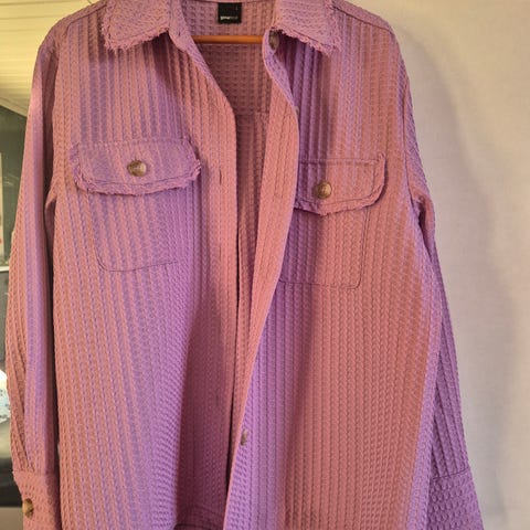 Gina Tricot skjorte for dame i størrelse S. Skjorten er lilla og laget i polyester. Den har strukturert stoff, krage og knappelukking foran. På brystet er det to brystlommer med klaff og knapper. Skjorten har lange ermer med mansjetter og knapper. Passer som lett overdel eller som lag over andre plagg.