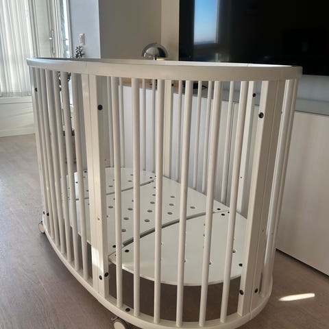 Stokke sprinkelseng i tre med åpning på siden. Delen der åpningen er kastet vi da denne var ødelagt. Nylig brukt av vår 3-åring som nå gikk over til en større seng. Rammen er godt brukt, men kan enkelt freshes opp med et par malingsstrøk. Madrassen har noe misfarging og et par flekker. En skrue er ikke original.