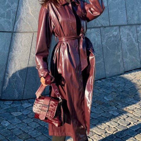 Kåpe for dame i størrelse M. Kåpen er svart og laget i polyester. Den har blank overflate, krage med slag, belte i livet og lommer foran. Passer som ytterjakke i overgangssesonger og kan brukes både til hverdags og mer pyntede anledninger.