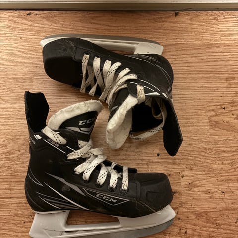 CCM ishockeyskøyter for barn i størrelse 36 (EU), tilsvarende US 3 skøytestørrelse og US 4 skostørrelse. Farge svart med lyse detaljer. Skøytene har snøring foran og plastklinge under. Egnet til ishockey og generell bruk på is for barn med skostørrelse rundt 36.