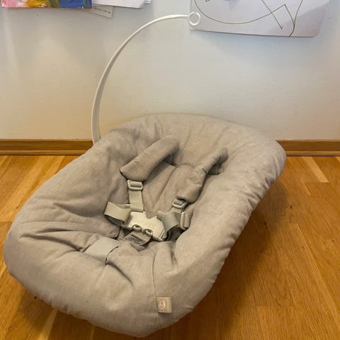 Pent brukt Stokke Tripp Trapp newborn seat. Hvitt sete med grå tekstil. Kjøpt nytt september 2025.