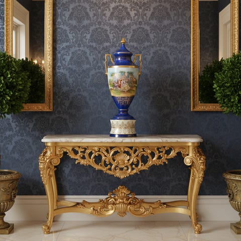 Design: Klassisk Rococo-stil, rikt dekorert med detaljerte englefigurer (putti) og håndlagde, påsatte porselensblomster.
