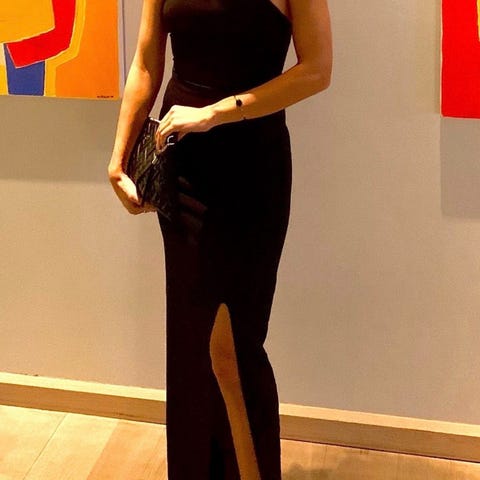 Festkjole for dame i størrelse 36. Lang kjole i grønn polyester med blank overflate. Énskuldersmodell med utskjæringsdetalj og dekor langs utringning og rygg. Egnet til fest og andre anledninger der man ønsker en lang kjole med markert fasong.