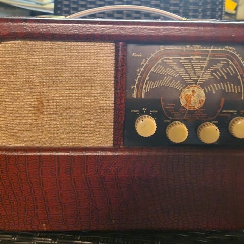 Flott vintage radio fra 1958! Radioen er ikke prøvd på en god stund. Radioen mangler batteri pakke og har et par sprekker i håndtaket og den kommer med den originale pris lappen fra DA (se bilder)
