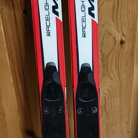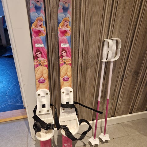 Snømann langrennsski for barn. De er ca 85 cm lange, med Rottefella-bindinger.