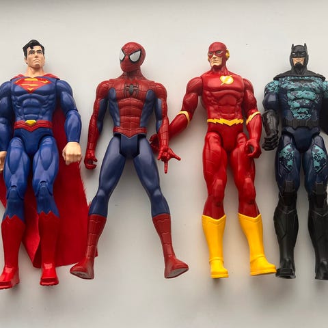 Marvel actionfigurer superhelter. Pakken inneholder flere figurer inspirert av kjente karakterer fra Marvel-universet. Figurene er laget i plast og har faste poseringer med enkelte bevegelige ledd. Egner seg til lek, samling eller utstilling for barn og andre som liker superhelttema.