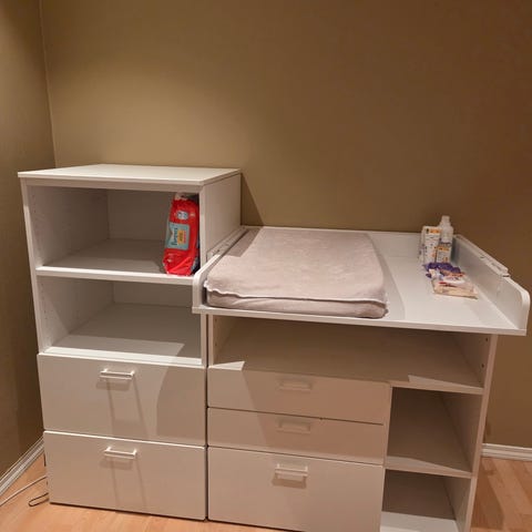 Pent brukt stellebord fra merket CAM selges. Fire skuffer - god plass til oppbevaring av klær o.l. Hjul er demontert ved henting. Stellematte med trekk medfølger.