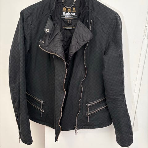 Barbour International Black Streak jakke for dame i størrelse 34. Jakken er svart og laget i polyester. Den har quiltet mønster, skulderstropper og glidelås foran. Innsiden har trykk av motorsykkelfører og merkelapper med Barbour International og Black Streak. Egner seg som lett ytterjakke i overgangssesonger.