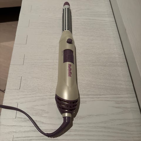 BaByliss varmluftsbørste i sølvfarge. Elektrisk hårstylingverktøy med roterende børstehode og avtagbart beskyttelsesdeksel. Har knapp for av/på og flere varme- og hastighetsinnstillinger. Egnet til føning og styling av hår ved å gi volum og form under tørking.Kjøpt for et år siden.