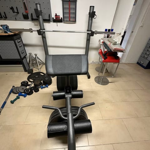 Selger en svært lite brukt benk med 2x5kg, 2x10kg og 2x20kg skiver. Nesten ikke brukt så er som nytt.