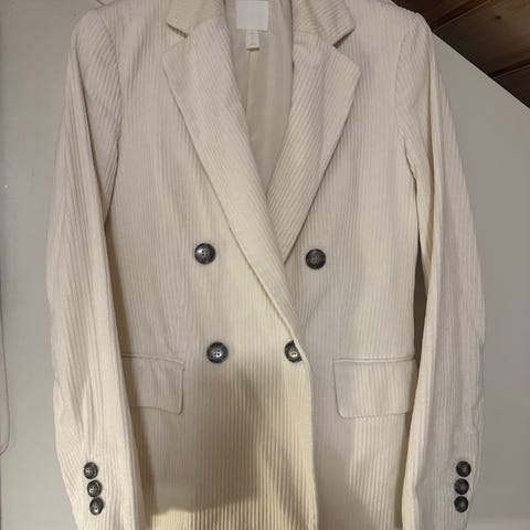 H&M blazer for dame i størrelse 38. Blazeren er blå og laget i polyester. Den har dobbeltspent lukking med dekorative knapper i metall foran og klafflommer på sidene. Klassisk krage og hel lengde på ermer. Egnet til bruk både til jobb, hverdag og mer formelle anledninger.