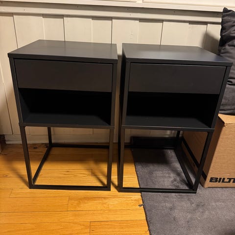 Selger to pent brukte nattbord fra IKEA i svart, modellen er Vikhammer. Begge er pent brukte med kun små bruksmerker. Selges grunnet flytting og at vi har kjøpt nye nattbord. Selges samlet og må hentes.