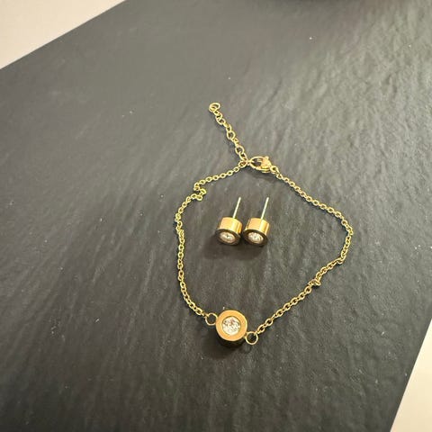 Smykkesett for dame i gullbelagt materiale. Settet består av et armbånd med sirkelanheng og et par øredobber med matchende sirkelmotiv.
