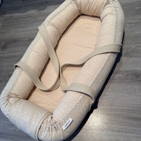 Liewood babynest. Babynestet har polstrede kanter rundt hele liggeflaten og justerbar åpning med snøring i fotenden. Vasket trekket nylig.