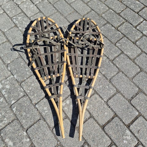 Canadiske truger. Vevingen er av råhud. Nye, «moderne» bindinger.