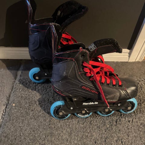 Bauer rulleskøyter i størrelse 43. Modellen har høyt skaft med snøring og flere hjul på rekke. Skøytene har sort overdel med røde lisser og lyse hjul. Egnet til rulleskøytebruk på jevnt underlag. Passer for voksne eller større ungdom med skostørrelse 43.