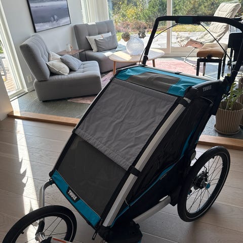 Kan brukes både som barnevogn og som sykkelvogn, avhengig av hvilke hjul og drag som monteres. Passer til transport av barn på tur, i hverdagen eller til trening der kombinasjon av sykling og trilling er aktuelt.