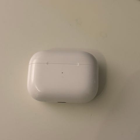 Apple AirPods Pro Etui. Den venstre øreproppen har en skurre lyd, så den er defekt. Den høyre virker. Ladeetuiet har indikatorlys på fronten og hengsel på baksiden. Passer til bruk med Apple-enheter og andre enheter som støtter Bluetooth-tilkobling.
