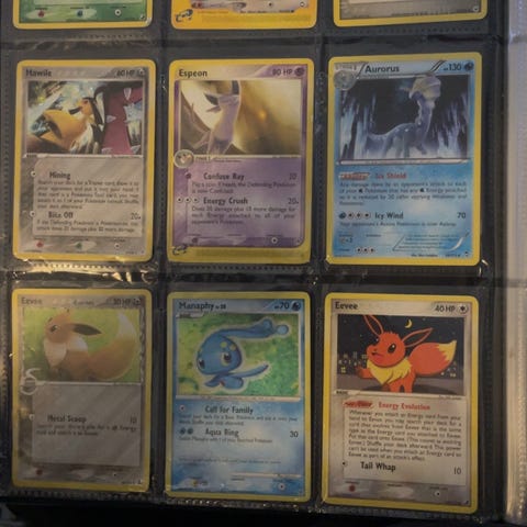 Selger en bunke Pokémonkort fra ulike sett.